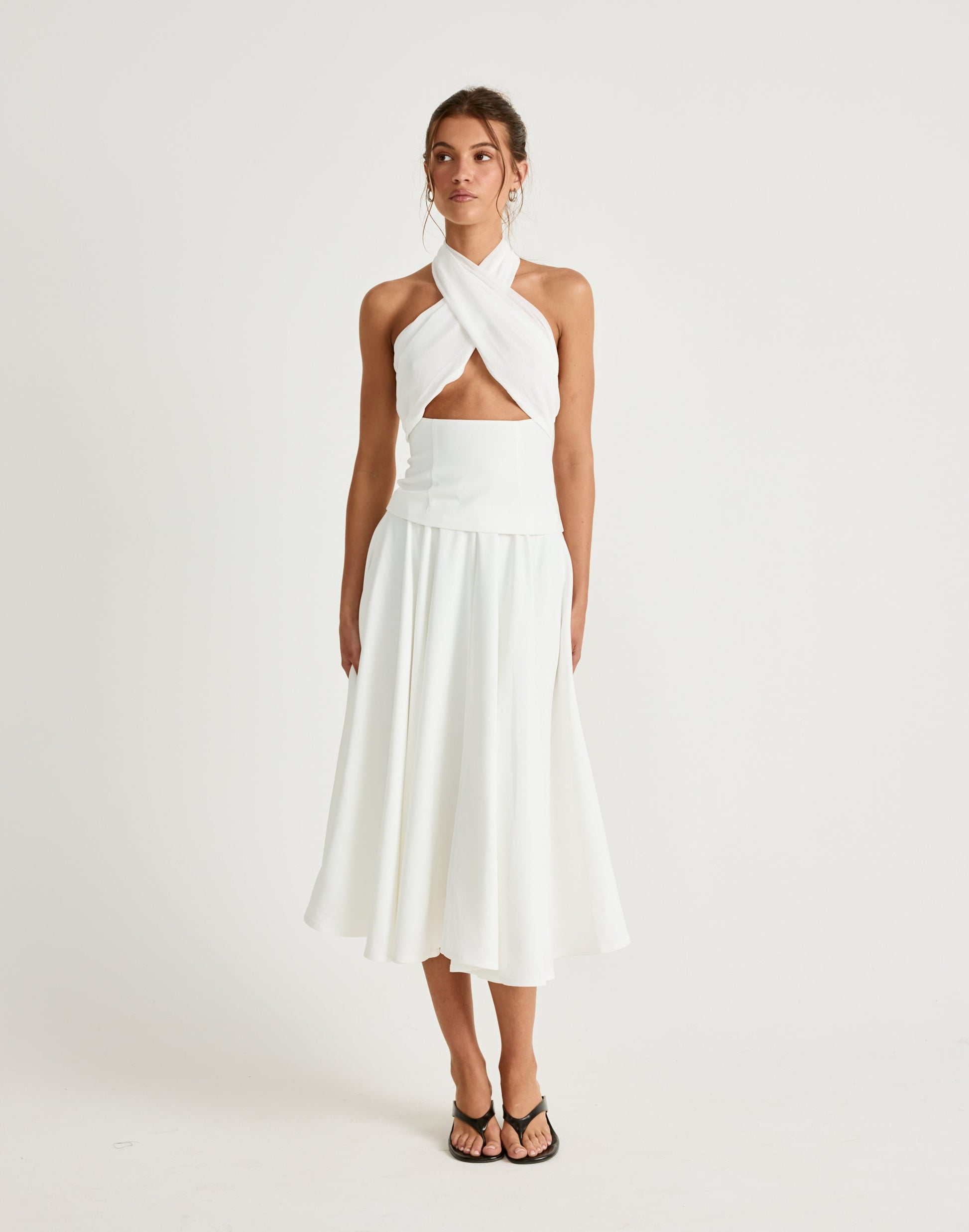 Introducing the Sara Midi Skirt — a mid‑length silhouette with a flared drape and refined simplicity, designed for versatile day‑to‑evening styling.