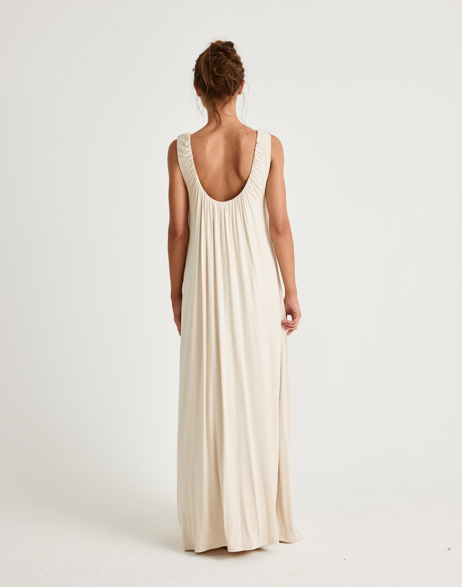 The Selena Maxi Dress is a floor-length essential with a deep scoop neckline and fluid drape—designed for elevated ease